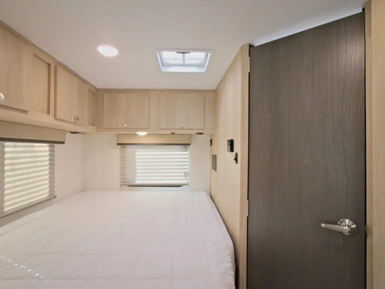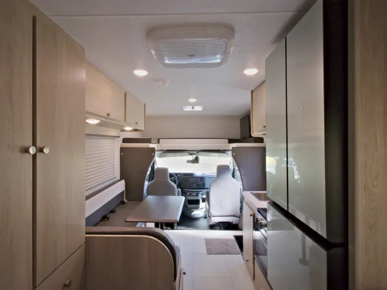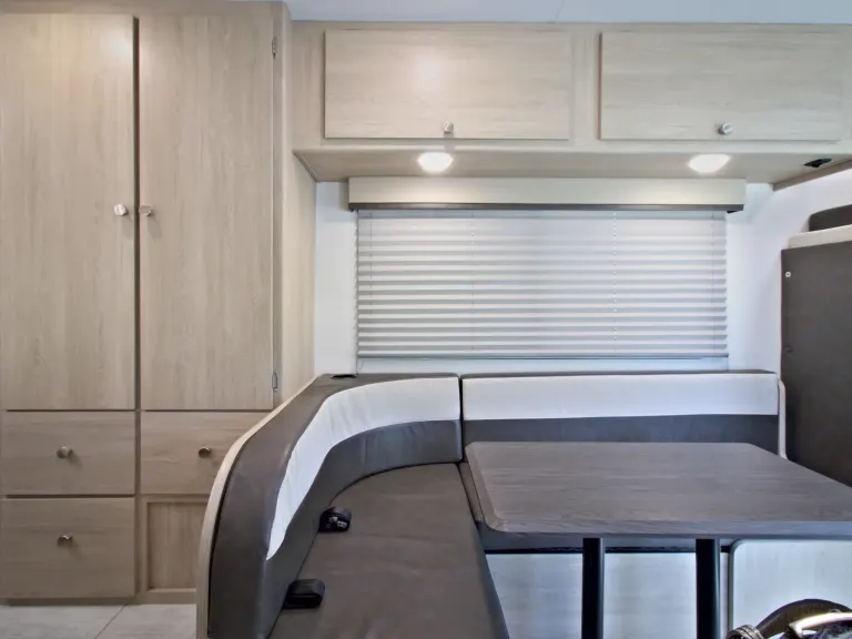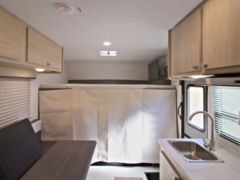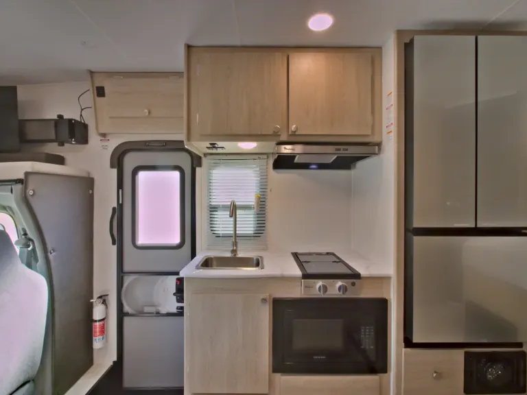 You will be met with comfort at every turn in this coach for six! Once you have stopped for the day, you can make lunch on the three burner cooktop and grab a cold drink from the 10 cu. ft. 12V refrigerator. There is a J-lounge with a pedestal table and extension where you can dine together, and the swing-arm TV in the cab will let you check the weather before heading outdoors. The rear corner full bath will let everyone freshen up when you return from hiking, and you'll enjoy a queen bed to sleep on each night, while your guest take the J-lounge and cab-over bunk!