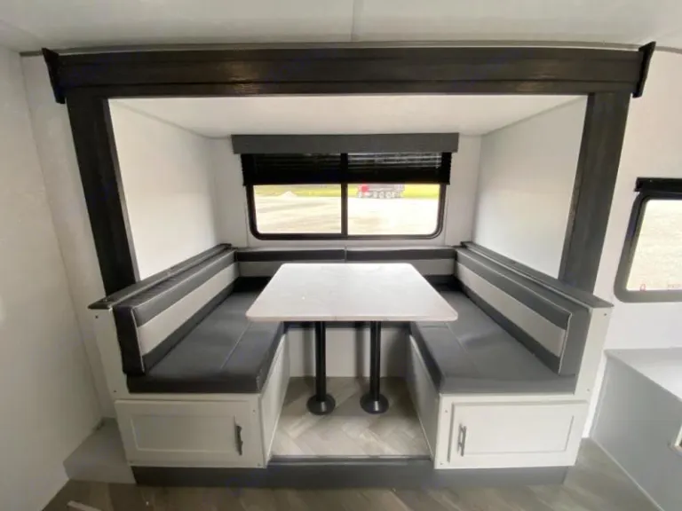 The kitchen slide provides extra room for the ever-popular U-dinette and includes a panoramic window. Camper comes fully stocked with pots and pans, dishes and silverware, toaster and(coffee maker upon request.)