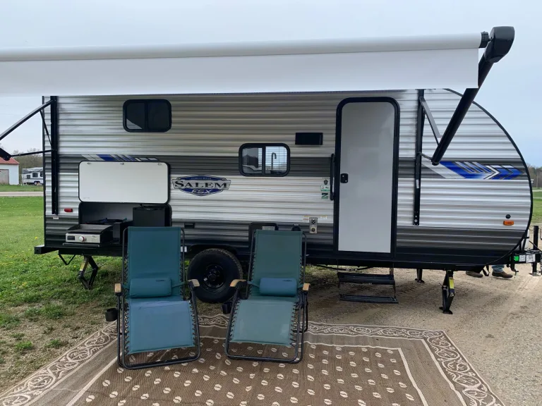 We have upgraded our camper to a brand new from the factory bunk house, complete with an outside kitchen and enough room to sit and sleep 8 people. We are empty nesters and old enough to know how important it is to get away. We take care of our camper so that you won't have any stress on your journey. We do a thorough inspection and a serious deep clean before we send you on your way. Here are some things to know about our camper: