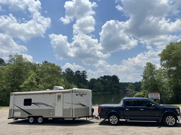 It can few pulled by any Half-Ton truck including, Ford F-150, Ram 1500, Chevrolet Silverado 1500.There is a Queen bed in the rear of the rig and the sofa turns to a bed.Kitchen features 3 burner propane stove, stainless steel sink, full extension drawers and Butcher countertops.Convection microwave oven. Plenty of cabinet space for utensils, and cooking supplies and storage.Tons of storage compartments in which we stock camp chairs, outdoor stove, bedding, RV friendly toilet paper, roadside assistance kit, all the items necessary to service your water and dump tanks, water hoses, electrical hookups...the things you need to RV properly. We will show you all the items at check out and how to use them.