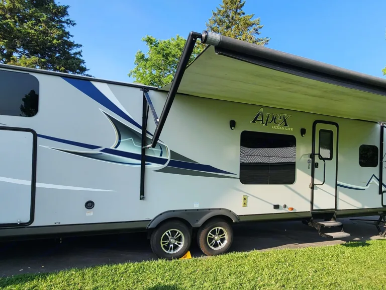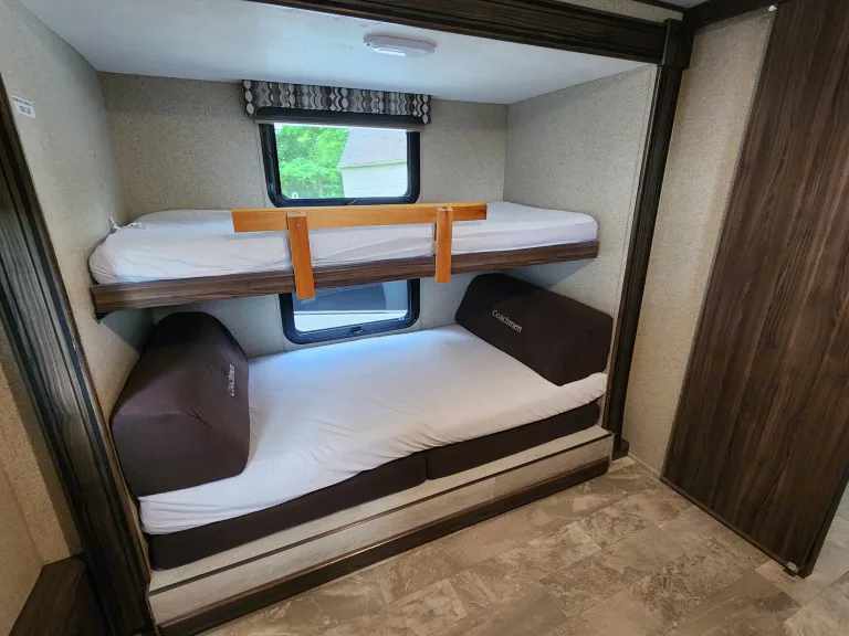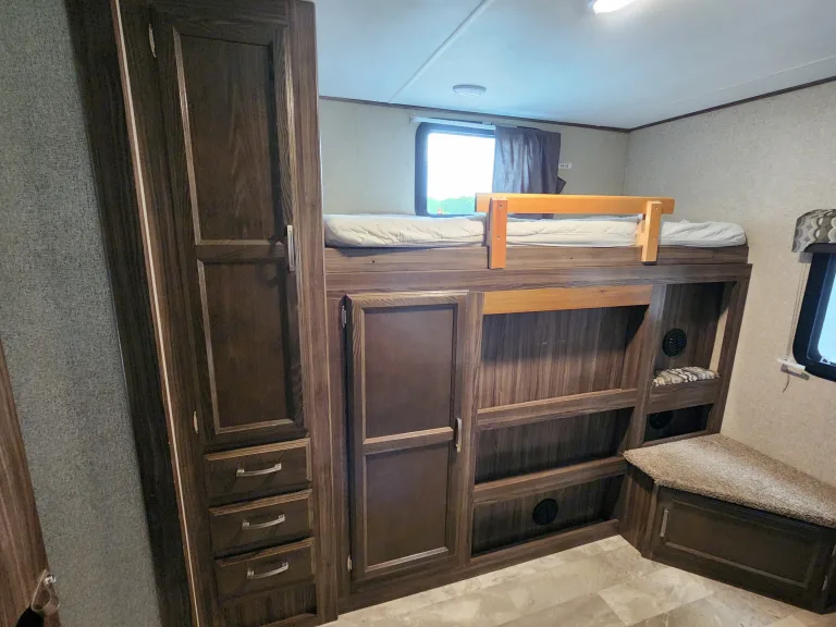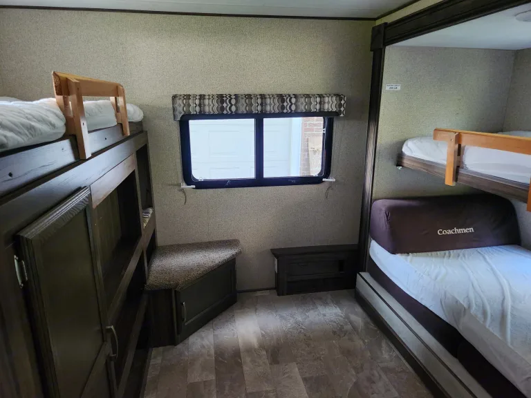 Don’t think twice about this one! Our beautiful 34’ trailer has 2 slide outs, a large outdoor kitchen, and just under 6000lbs! It sleeps up to 8, with a 4-bed bunkhouse at the rear. It is spotless and comes fully stocked with everything you need to cook those delicious camping meals. The outdoor kitchen gives you additional cooking and fridge space and allows you to be outside for every meal.Inside this spacious trailer, you will find a super cozy full queen mattress in the master bedroom. There is plenty of storage, and you are able to sleep soundly with the doors shut!The open living area has a dinette with seating for 4 and plenty of empty cupboards for your groceries. The slide-out contains the pull-out sofa that will comfortably sleep 1 child, as well as the kitchen. The kitchen is fully equipped with everything you could think of, and enough dishes for a family of 8.The separate bunkhouse at the back of the trailer is the most amazing space for your children. It has 3 beds and a pull-out mattress for the floor. The space is great for a rainy day and even better, a peaceful night's sleep for everyone! The large slide-out makes it feel extra spacious.We have rented trailers out for 5 years, with many repeat renters and positive feedback. We sold our trailers due to changes in life, but missed owning so much, so here we are again!4 night minimum on long weekends