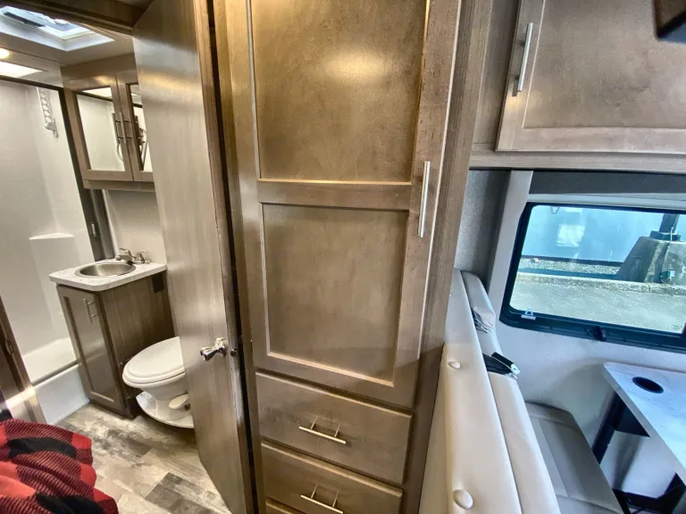 Features include: A kitchenette with a sink, microwave, fridge/freezer and gas cook top. Bathroom with an indoor shower, toilet and sink. Bluetooth setup to connect your phone for music with speakers throughout the RV. An automatic awning for days when the sun is just a little too hot or rainy days so you can enjoy the outdoors without getting wet! 100W solar panel to keep your devices charged without the need of using an onboard generator, which there is also.