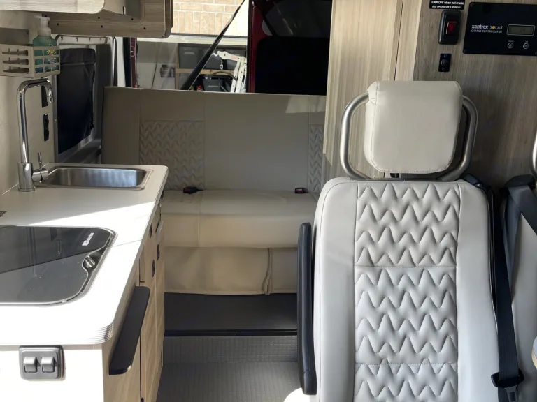 6 seatbelts, sofa bed and pop-top bed. 20 gal on board water tank, 22 gal grey tank & 5 gal black tank easy removable cartridge to dump. Propane stove and heat Solar electric for usb outlets and runs lighting/small fridge.What's included• Toilet paper & paper towel