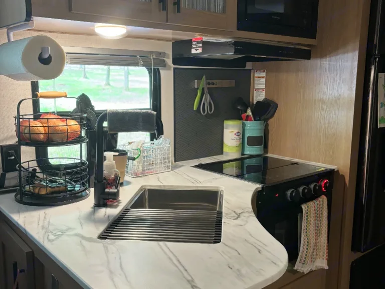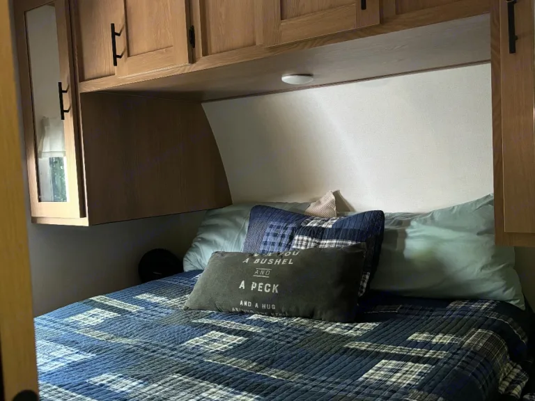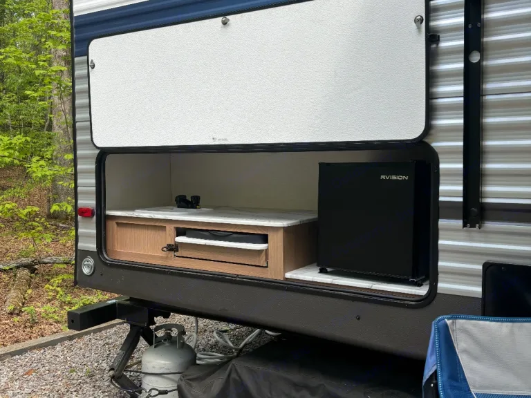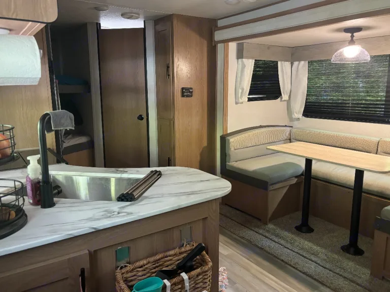 This is a great family camper with a queen bed in the front, 2 full-size bunks and a convertable dinnette. It has one slide-out. This camper is perfect for 2 people up to 8 people. It also has a small outdoor kitchen area with griddle, fridge, and sink. What's included• All linens