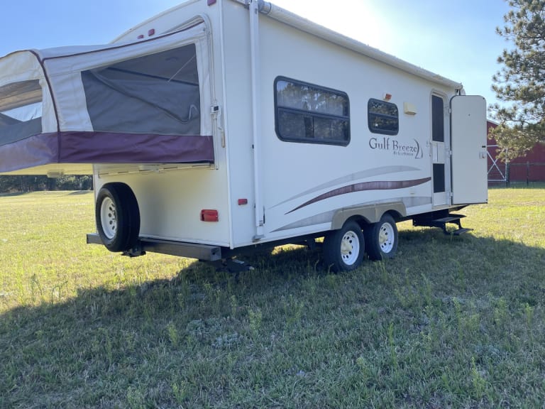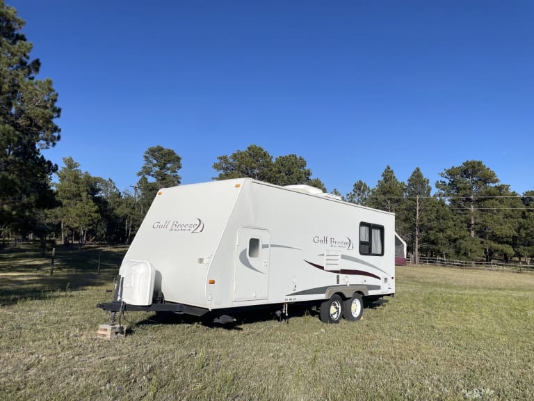 Our trailers is a 23' pull behind hybrid travel trailer. 4300 lb dry weight makes it an easy pull behind most vehicles. Perfect for a weekend of dry camping or in a campground with full hook-ups.Recently updated interior with cozy accommodations that comfortably sleeps up to 6 when the hybrid end is opened up. Can easily sleep 4 if you keep the hybrid end closed up. Features a gas stove, gas/electric refrigerator, microwave, hot water heater, and bathroom.What's includedCamper is equipped with fresh linens, cookware, utensils, paper towels, towels, and toilet paper.Leveling blocks and tire blocks are provided. Hoses for water connections are provided. RecommendationsThere are several wonderful locations in the beautiful Rocky Mountains that can be explored while renting our camper. Other things to notePets allowed!