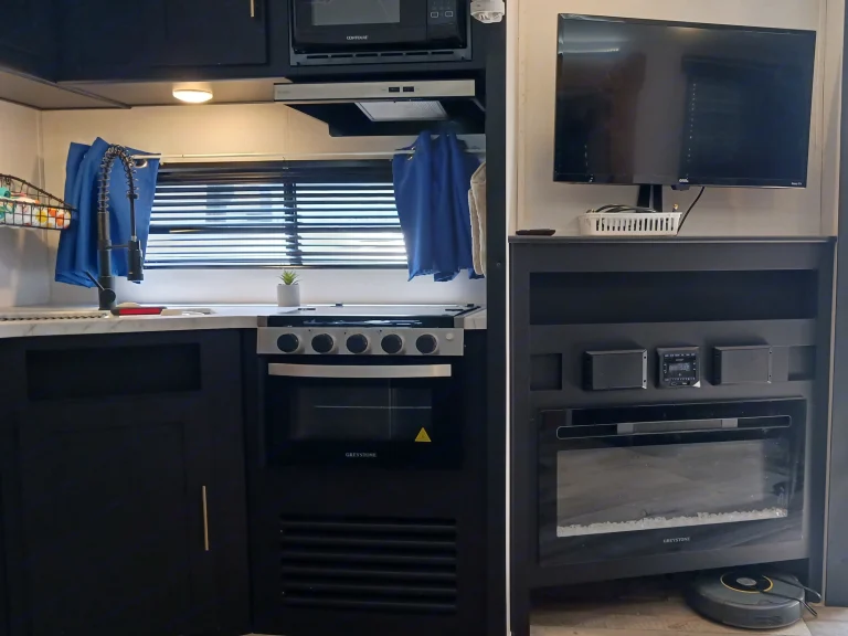 It has a TV in the living area & one in the bedroom, a stereo with inside & outside speakers and a fireplace.