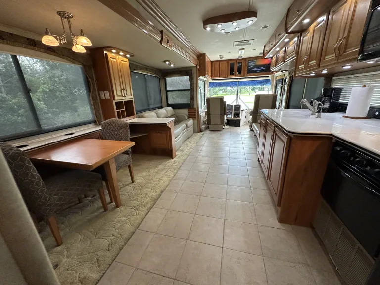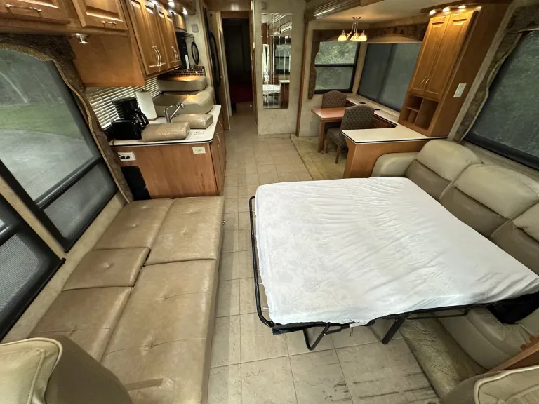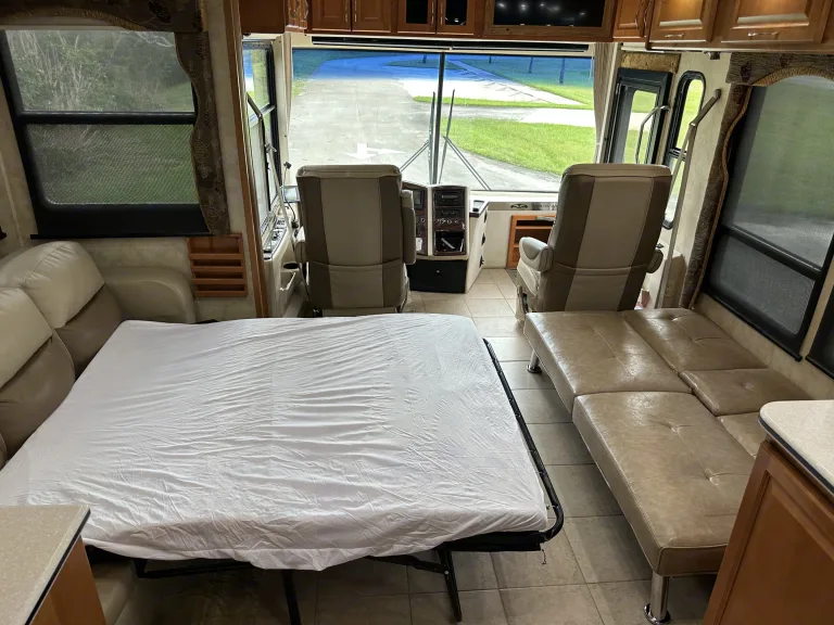 What's includedExtra tall Ceiling (7' 6") The tallest RV. DIESEL Pusher MERCEDES. The Whole Unit is Fully Tuned Up and has BRAND NEW TIRES AND BATTERIES. Aluminum Wheels. Needs Nothing. High End everything, very luxurious RV. Advanced Inverter, rain sensor auto awning, 2 FLAT SCREEN LED TV's 32" with apps Radio, DVD cd player, Advanced NAVIGATION. Ice maker, new batteries, new everything, Equipped with Diesel pusher MERCEDES diesel low torque, air ride suspension, air brakes, air horns and engine exhaust brake, FREIGHTLINER Raised Rail Chassis, Onan 7500 diesel generator barely used Fully tuned up, everything new, back up camera, Automatic leveling jacks, central air and heat gas and electric, 3 WAY WATER HEATER electric, propane and engine heated. Huge storage cabinets and more. It has walking closet room with stackable washer and dryer with clothes folding counter top. Incredible spacious RV. Has leather seats everywhere, Recliner mattress bed, pull out leather couch bed, solar powered battery charger, powered Remote controlled awnings plus porch awning, satellite tv. Plus much more, It has Remote Control Slide Outs. Central Vacuum