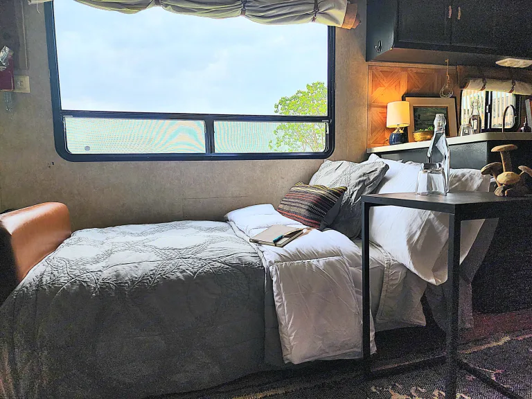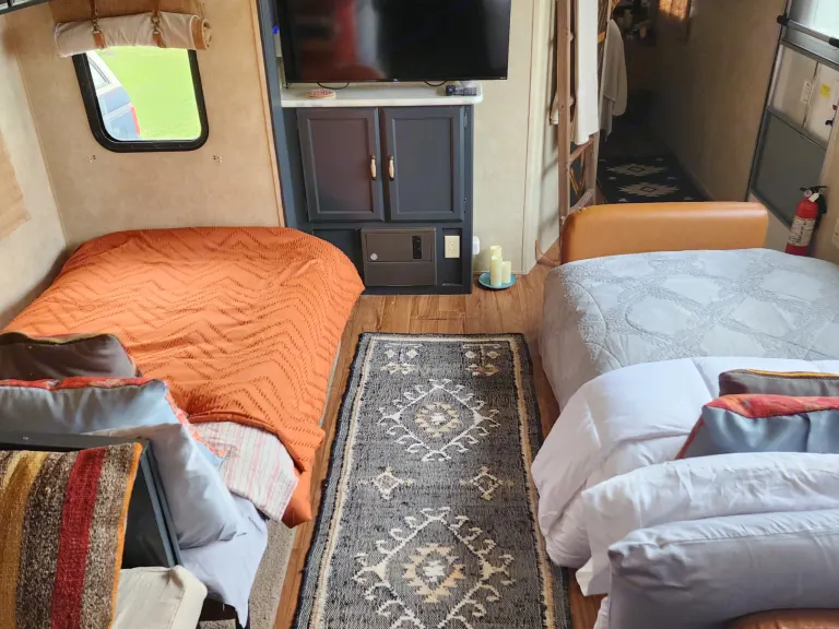 Enjoy your day relaxing outside listening to some tunes on the outdoor speakers, under the large retractable awning. Chairs and outdoor rug provided.Finally, the serene master bedroom is the perfect place to end your day, providing; complete privacy, a full size queen bed, plush bedding and pillows, Roku smart TV, overhead reading lights, and ample storage.It is our goal to make this trip enjoyable and memorable for everyone.