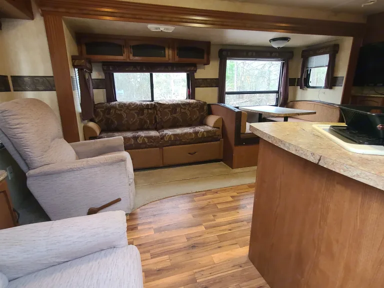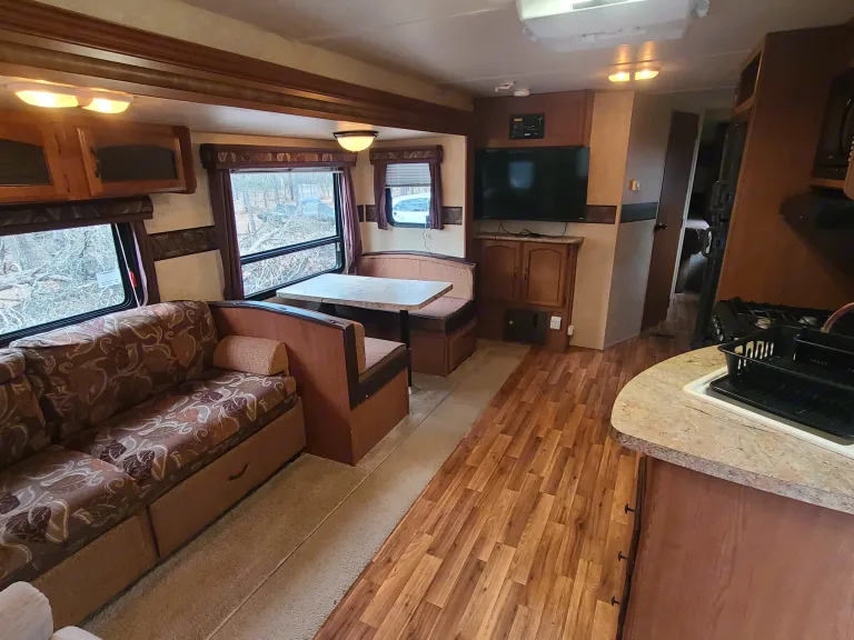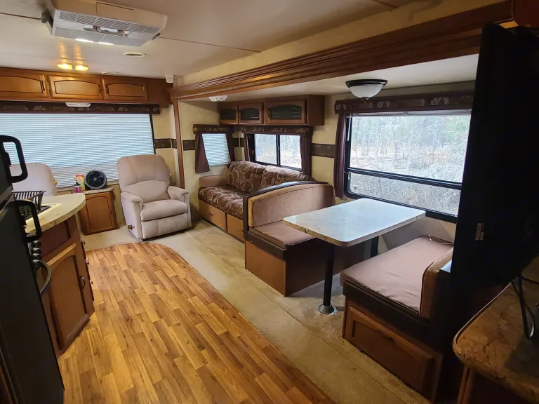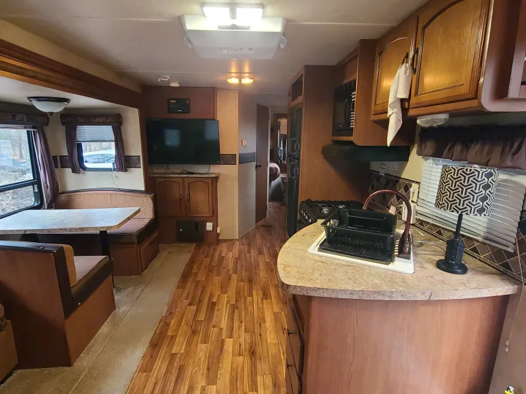 Nice travel trailer here...very large..feels like home away from home. Large living area slide out. Excellent for a duo...but can house a single family plus. Comfortable well maintained travel trailer.: Full kitchen with pot, pans, coffee maker, dishes, etc...