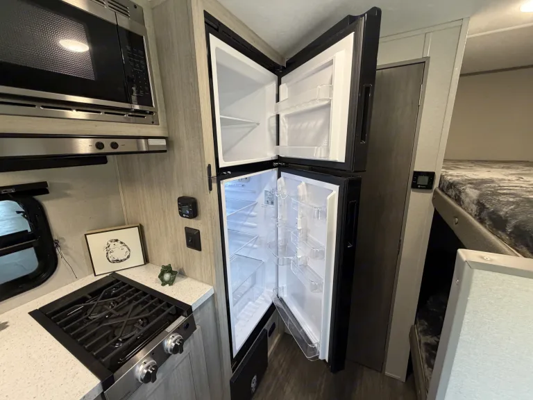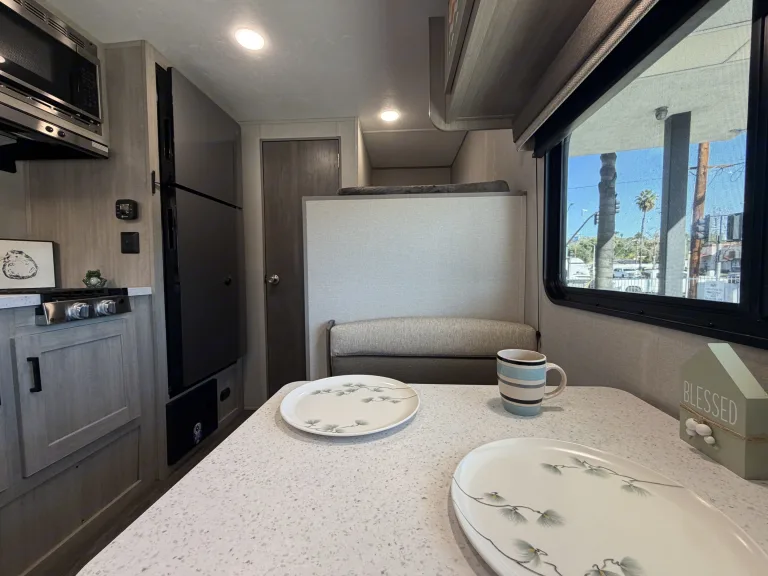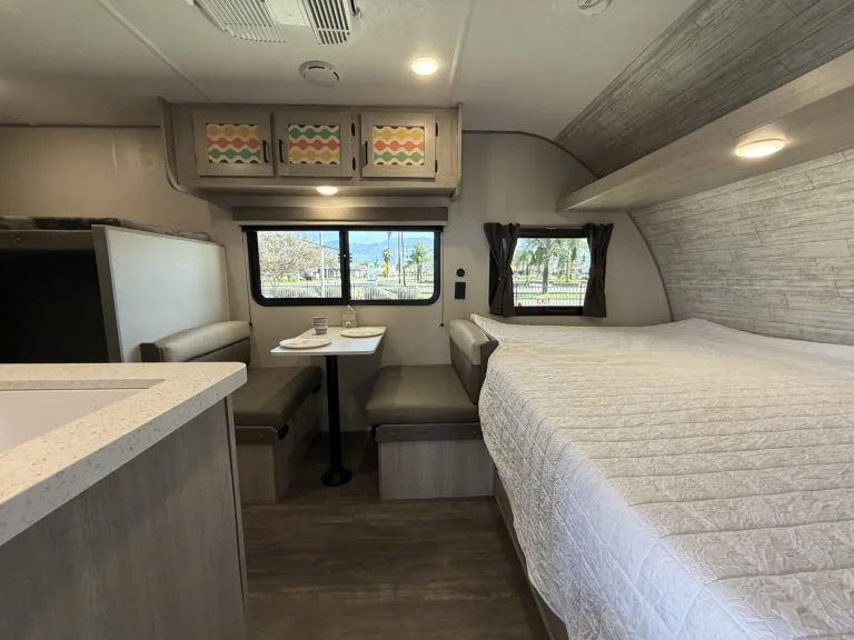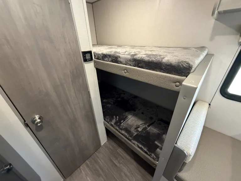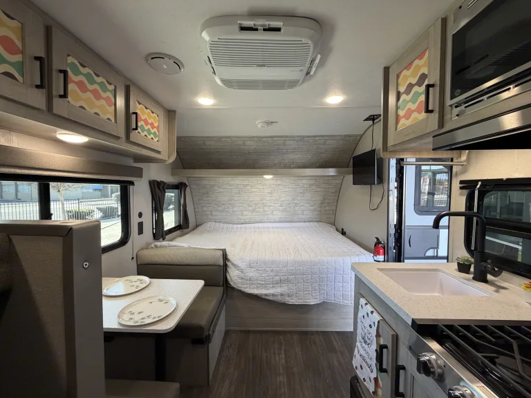 Bright RV rental interior: dinette, main bed, bunk bed, & kitchen counter. Modern design with outdoor views.. Forest River Aurora Aurora 2026
