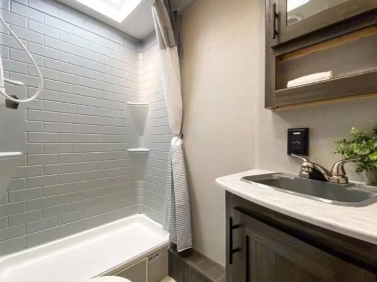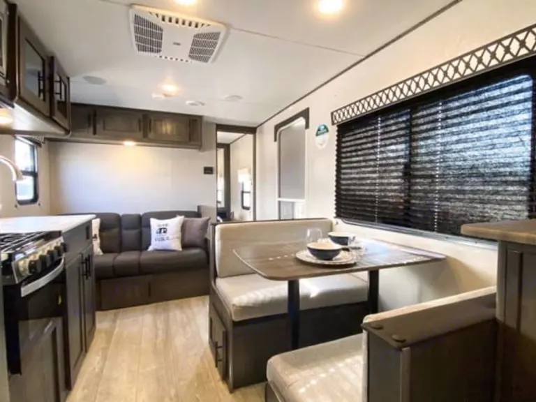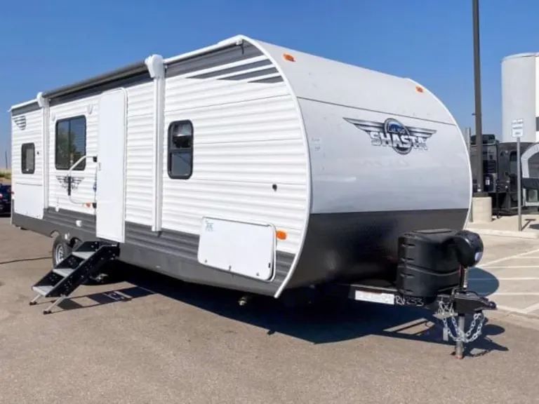 Experience the Shasta Oasis, 26BH is a family-friendly, bunkhouse-style travel trailer offering comfortable sleeping for up to 10 people with smart use of space and thoughtful amenities, an ideal getaway for adults wanting privacy while making lasting memories with their kids. The spacious Queen suite provides ample storage, complete with overhead compartments and wardrobe closets beside the bed. Kids will enjoy the comfortable bunk beds or the dinette that converts into a bed at the rear of the trailer. With a fully equipped kitchen and outdoor amenities such as a sink, grill, and mini fridge, the outdoor adventure is sure to be filled with unforgettable family moments!**Sleeping options:**- 1 private queen bed (2 adults)