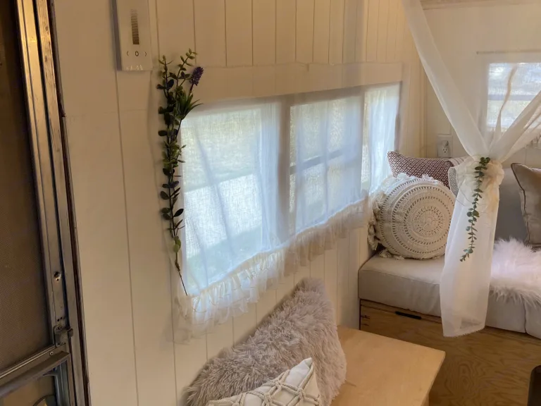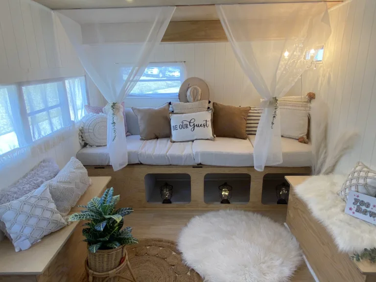 This vintage glamping trailer will leave you with plenty of happy memories & amazing photos! 2000lbs maybe less. 17ft long, pull behind.I have designed this for a luxurious stay in the great outdoors with a vintage boho ambiance to ensure you feel cozy and classy while exploring all the elements nature has to offer .This trailer allows & consists of: