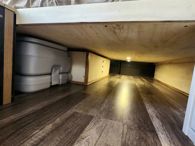 Under-bed “garage” storage — huge space for bags/gear