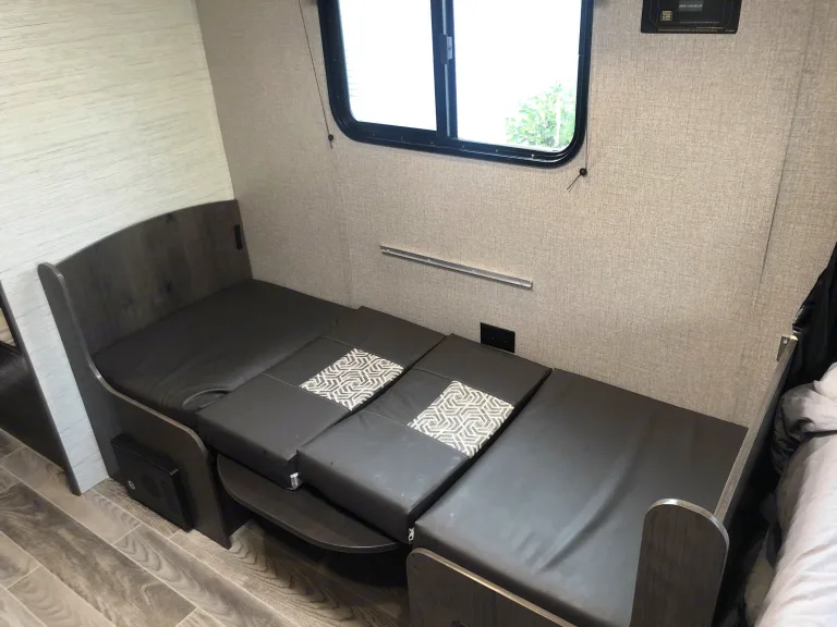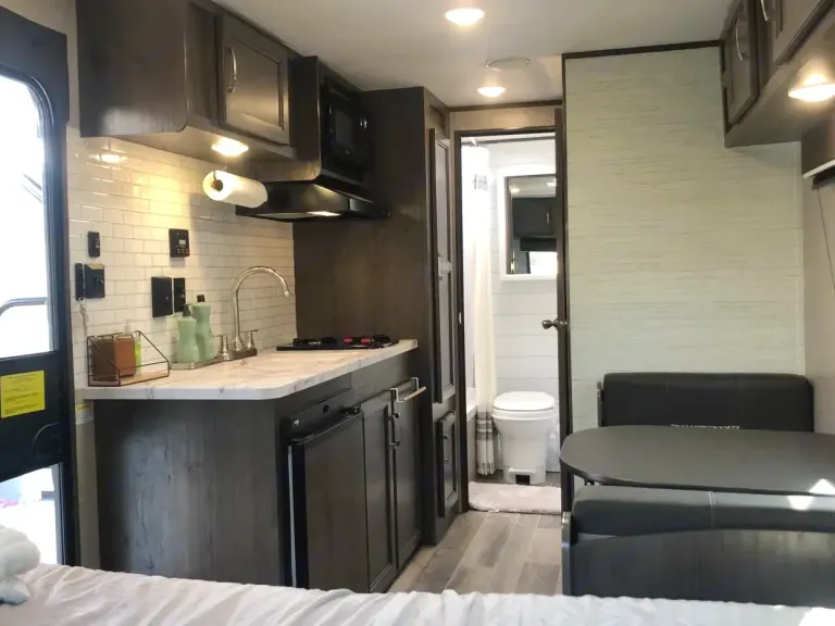 Our 2021 modern trailer is the perfect size trailer for your family of 4 (Or 5 if you want to be cozy) It's stocked with all the essentials and is ready for your family to experience the freedom of the outdoors! Has a queen-size bed, bunk beds, and a dinette that can fold down into an additional bed.Empty weight of 3185 lbs makes this trailer easily towable with most large SUV’s and small trucks.Unit has a bathroom with a toilet, tub (perfect for kids baths) with a shower (Hot Water Heater provides hot water). There is a fridge with a freezer and a microwave. Our unit has an 8,000 BTU Air Conditioner and a furnace-style heater to keep you nice and comfortable wherever you go. Has Bluetooth Indoor + Outdoor Speakers and an automatic 10ft Awning with LEDs.No Off-Road Destinations.Comes with all the necessities free of charge: