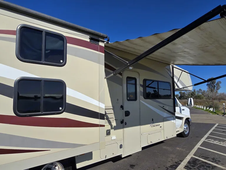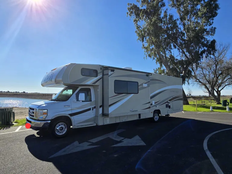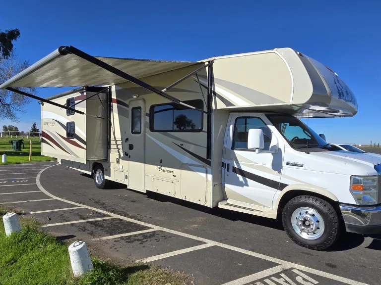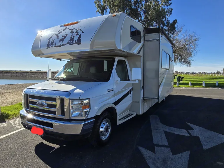 This is a long Class C RV. The rear end will swing out as you make turns and even pull out from a parking spot. Use your mirrors and take your time. When backing the RV, have someone assist you and making sure everything is clear.