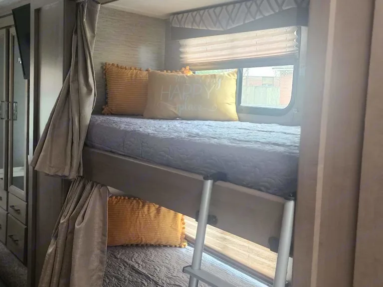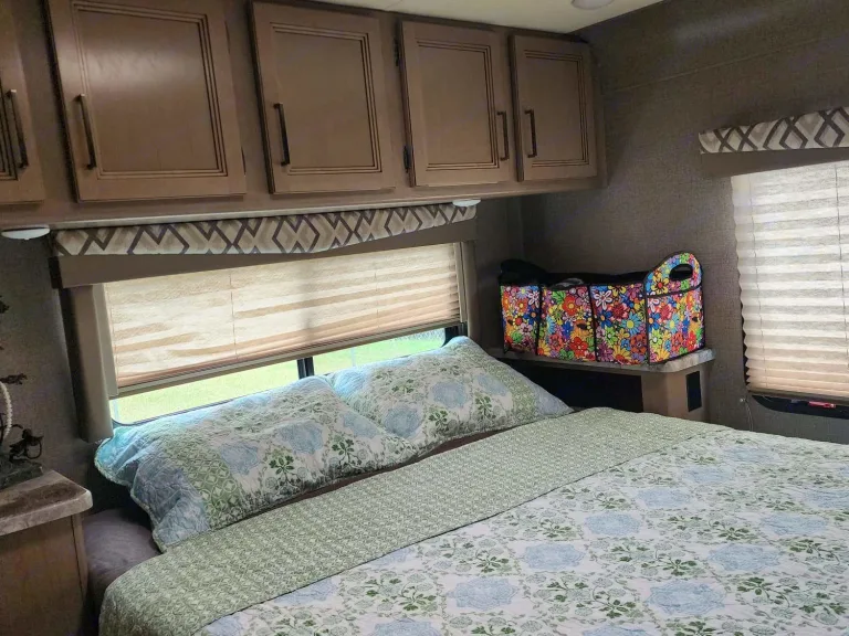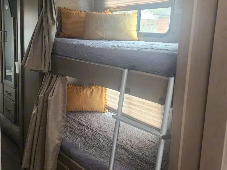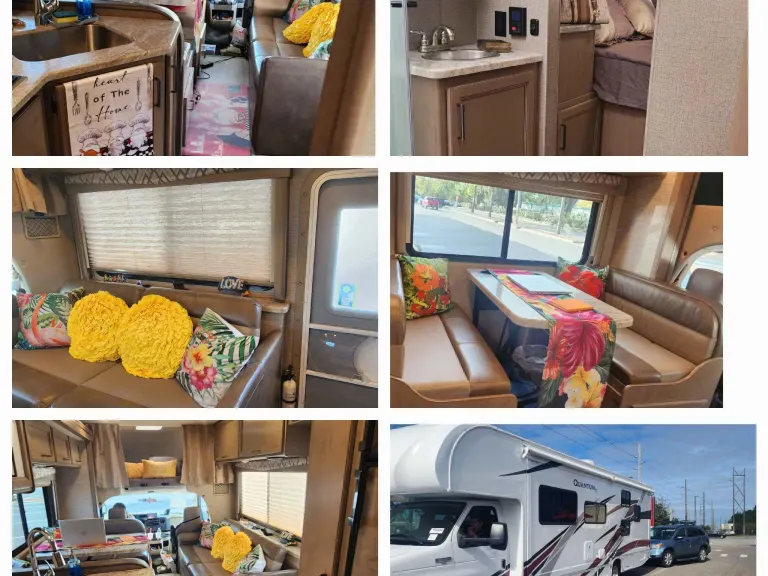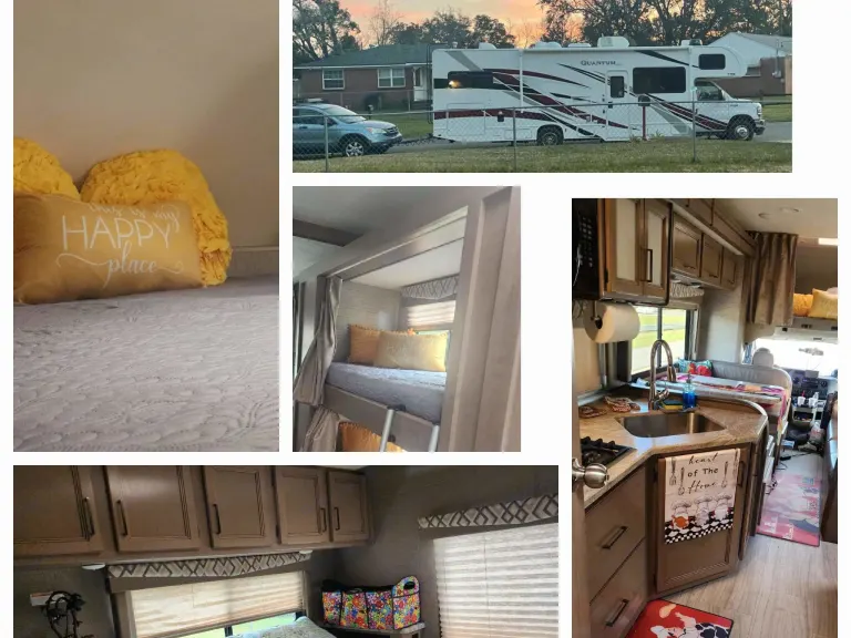 Well kept and maintained motor coach, with added equipment like 4 batteries and solar panels and inverter for increased energy capacity without using the generator. Very rummy.As you enter the RV , you will face the kitchen. And to the right of the kitchen, you will see the dinning table which converts into a bed at night. A cross the dinning table, there is a sofa bed. Above the Driver and passenger seats, there is a bunker with full size bed. Above the Driver seat and overlooking the bunker and di ning and sofa bed, there is a movable 32 inch smart TV , Rocku ready. To the left of the entrance and across the kitchen, you will find the refrigerator. Around all these area, in top, you will see plenty of cabinets to store food and clothing, bags, etc. Going more to the left, you will ser on your left the complete bathroom. And to the right, you will find 2 si gle bunker beds. Also, several cabinets to store clothing. Lastly, follows ghd master bedroom with lots of cabinets and closet to store clothing, etc. It also has a 32 inch TV, rocku ready. The RV is ready with free oc as l channels, which reprograms easily in every city in the US. It also comes ready with Barbecue ready connection.What's included• Basic utensils, toiletries, basic bathing soap and shampoos.
