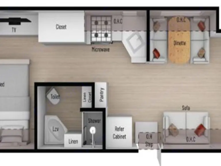 All-in-One Bath: A center-located private bathroom features a shower, vanity, and toilet behind a door.Kitchen Amenities: Full galley kitchen with double sink, residential fridge, convection microwave, oven, pantry, and ample storage.Amenities