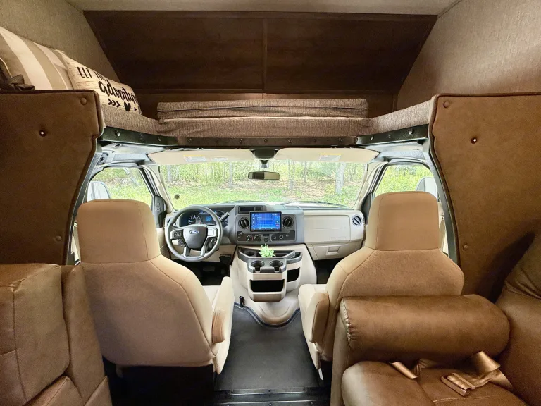 Chassis & Power: Built on the Ford E‑450 with a 7.3 L V8 engine delivering 350 hp and 468 lb‑ft torque; 6‑speed automatic transmission, regular unleaded gas.Size & Capacity: Measures about 32.8 ft long, just over 8.4 ft wide, and 11.25 ft tall. Gross Vehicle Weight Rating (Gvwr) is 14,500 lb, with a 55‑gal fuel tank, 40‑gal fresh, 28‑gal gray and black water tanks, and a 12.2‑gal propane tank.Interior & Sleeping
