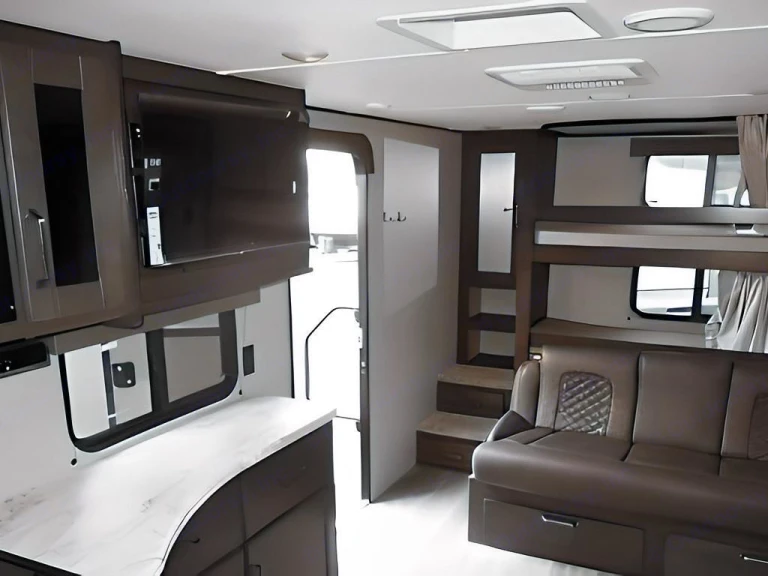 This spacious and contemporary RV is ideal for families or larger groups seeking a comfortable and convenient way to travel and explore.The Transcend Xplor 265BH measures 31 feet long and weighs just over 6,000 pounds. It boasts a private bedroom with a queen-sized bed, a bunkhouse with double-sized bunks, a full bathroom with a shower, and a fully equipped kitchen featuring a refrigerator, stove, oven, microwave, and sink.The living area includes a cozy sofa that converts into a sleeping space and a booth dinette that converts into a bed. Equipped with air conditioning and heating, the trailer ensures comfort regardless of outdoor weather conditions.What’s more, the Grand Design Transcend Xplor 265BH has a power awning, outdoor speakers, and ample pass-through storage for all your gear.