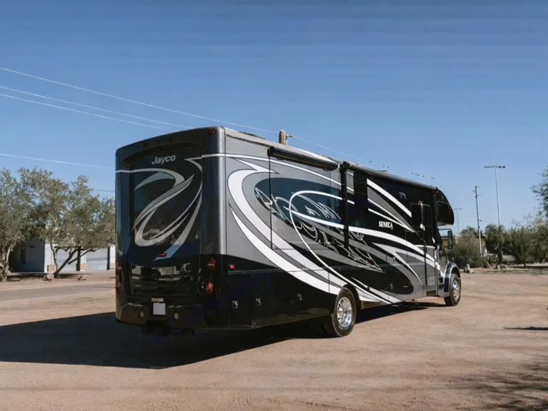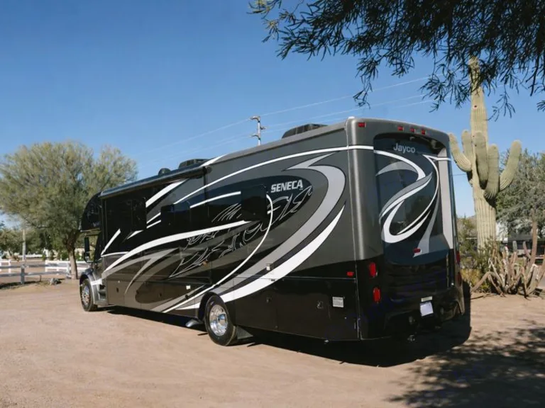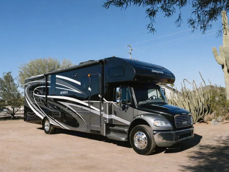 For any camping trip you take, you will want this Jayco Seneca Class C diesel motorhome to be the vessel that gets you there. The two slides open up the interior and give it plenty of room for full-size amenities, like the convection microwave and 21 cubic foot residential refrigerator in the kitchen. Not only does this model have enough room for all of your favorite amenities, but it also has enough room for all of your favorite people because of its ability to sleep nine people at bed time. You and your family will love gathering together each night in the living area as you play a card game together on the booth dinette or rest on one of the sofas.With a Jayco Seneca motorhome, you will not only enjoy each vacation destination, but you will also enjoy the ride getting there because each Seneca includes enough luxury for the long haul with features like the JRide Premium which is a driving system with a powerful blend of precise handling and renowned stability that all rests upon the Freightliner S2RV chassis and Cummins ISB 6.7L, 360 HP diesel engine. The high-gloss, fiberglass exterior with its deluxe full-body paint and diamond shield are what first attract you to this sleek RV, and the touchpad locking system with keyless entry makes it easy to access the interior whenever you need. You may find yourself spending all of your free time outdoors because of the exterior entertainment center that comes with an AM/FM/CD/DVD player and a 39" LED TV that will allow you to watch a movie in the cool night air underneath the stars, and the outdoor shower will come in handy when you need to rinse off any dirt that you don't want to bring inside.What's included• We stock all of our units with the essentials like: