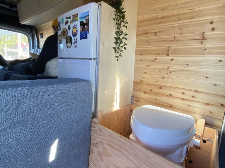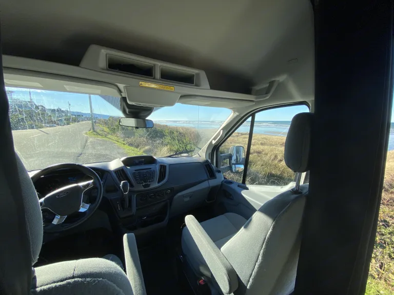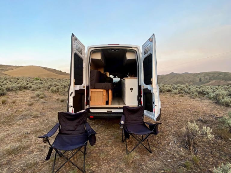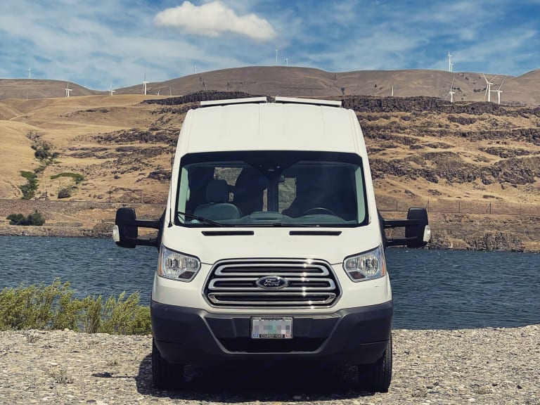 Belle is a newly converted, jam packed 2016 Ford Transit ready for your adventures. We have travelled across the United States in Belle, and now it's time to share her with others.Inside might be the largest fridge we could possibly find for a van. She's outfitted with an electric induction cooktop, sink with electric pump, a 30 gallon fresh-water tank, and ample storage for all of your culinary needs. An electric hot water tank for outdoor showers (we throw in a privacy tent if you want/need), and composting toilet to take care of your business. Kick back and relax with the futon-style bed with memory foam mattress. The passenger seat swivels, making it fit four comfortably for hanging out, and sleeps two. Belle is a fully self-contained adventure-mobile!The van has cruise control, Bluetooth, USB/AC/DC ports, solar panels, four batteries that power the entire interior, a rooftop fan for air circulation, and tons of storage.Bring Fido along on your journey and get ready to create incredible memories!We are unable to offer refunds for shortened trips if for some reason (e.g. weather, change in schedule) you return the vehicle early.What's includedRental includes pillows, bedding, comforter, kitchen utensils, four dish sets, coffee maker, paper products, 1 set of towels, hand towels, and washcloths per person.RecommendationsExplore the beautiful Pacific-Northwest in this comfy, cozy rig. Other things to noteNo smoking of any kind allowed inside the van.While we highly encourage exploration, Belle is not equipped for off-road use. Please treat her with respect and extreme caution if going off of paved roads.