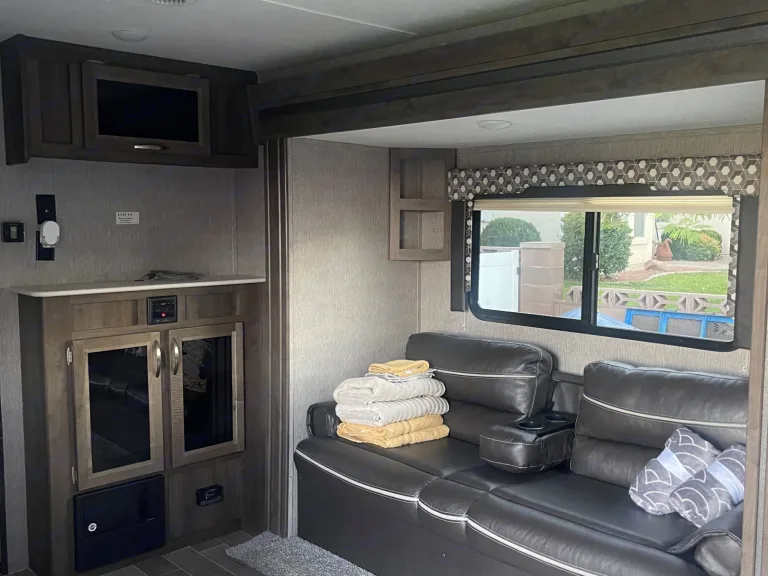 This is a bumper pull camper with self-stabilizing jacks that is ultra-light and can be pulled with a full-size SUV- All you need to do is show up to the mountains, desert or lake and find the perfect spot. This camper is perfect for providing refuge from the heat and cold and is a super cozy place to wind down from a day of fun and get a great night's sleep.What's includedThis camper comes with everything you will need for a great camping trip. Basically, all you need to bring is food, drinks and extra blankets.