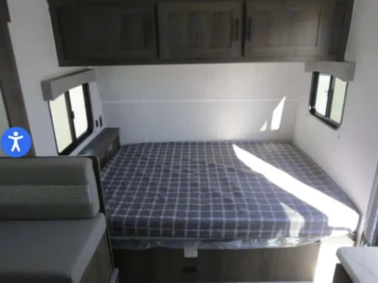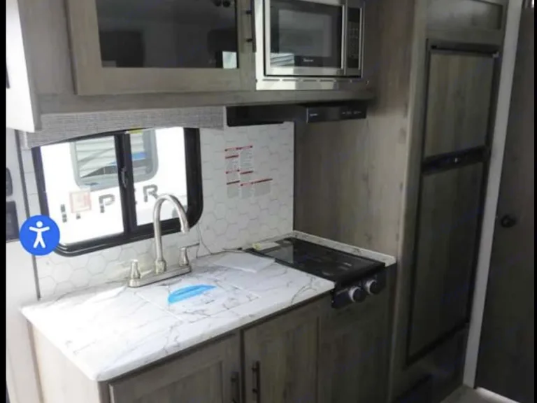 Our travel trailer sleeps up to 5 and includes a stove, sink, refrigerator, microwave, air conditioning, and furnace. The rig has one slide, creating plenty of room to cook and even fit a pack and play if your little one is joining you on your journey! There is plenty of storage in the camper with doors that stay shut while in route.While we ask that you use the campground restroom for your business, please feel free to shower inside, or outside using the outdoor shower!This camper is perfect for a getaway with friends and family. Please reach out with any questions!