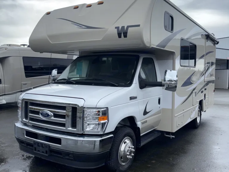 2025 Winnebago Spirit 22M Class C RVGet ready to hit the road in style and comfort with the 2025 Winnebago Spirit 22M Class C RV. This spacious RV has sleeping accommodations for up to 5 people, making it perfect for families or groups of friends. The interior is equipped with a range of amenities to make your trip enjoyable, including an amplified digital Hdtv antenna, black-out roller shades in the lounge, dinette, and bedroom, and LED lighting throughout. The kitchen features a microwave oven with touch control, a vented range hood with light, a 3-burner range with glass cover and oven, and a pantry for storing all your cooking essentials. The bathroom includes a shower with a wall surround, a toilet with a foot pedal, and plenty of storage space for your toiletries.On the exterior, you’ll find premium high-gloss fiberglass skin, a large lighted trunk storage compartment, and a powered patio awning with LED lighting. The RV is equipped with a 20,000 BTU furnace and a 15,000 BTU air conditioner to keep you comfortable in any weather. Other features include dual pane windows, leatherette seating, electric stab jacks, rear colour camera 32″ HD W/DVD Player, solid surface countertop,