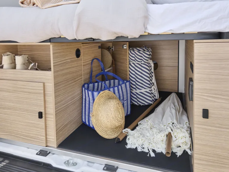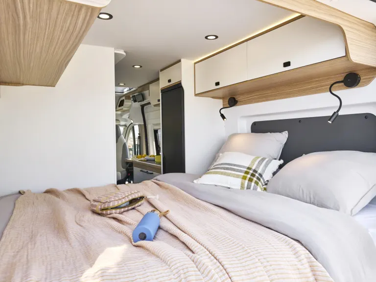 Le V600G est équipé d’un lit garage transversal, avec un matelas confort à mousse haute résilience et un sommier à lattes. Les dimensions maximales du lit sont de 143 x 194 cm. De nombreux placards de pavillon sont disposés de part et d’autre du lit et dissimulent des ports USB et des liseuses. En option, vous pouvez ajouter un plus grand placard de chambre. Sous le lit, une large soute vous permettra de stocker tout le nécessaire et d’accéder facilement au compartiment à gaz et au réservoir d’eau propre.
