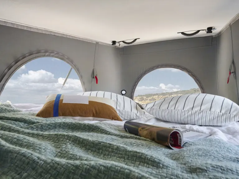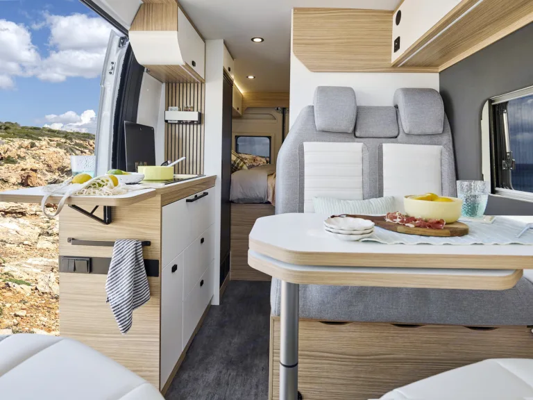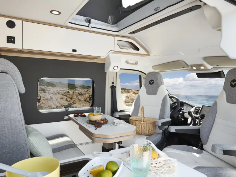 Avec le V600G, vous bénéficierez d’un grand espace salon où vous pourrez vous installer confortablement à 4 personnes, grâce à la large banquette arrière et aux deux fauteuils cabine pivotants. Des ports USB et une prise 230 V sont facilement accessibles pour vous permettre de recharger vos appareils électriques. La table, installée sur rails, se glisse pour laisser plus de place d’un côté et de l’autre. Elle peut également être installée à l’extérieur pour vous permettre de déjeuner au soleil. Le salon est également pré-équipé des câblage nécessaires pour installer une antenne satellite et un téléviseur. Enfin, pour garantir une belle luminosité à l’intérieur, le toit est équipé d’un toit ouvrant panoramique de 62 x 42 cm avec occultation et moustiquaire.