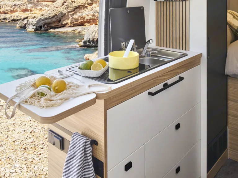 La cuisine du V600G est conçue pour vous offrir un maximum d’aisance. Elle est équipée de quatre tiroirs avec freins de fin de course et d’un meuble de pavillon. Sa plaque de cuisson à deux feux, dotée d’un allumage piezzo, est complétée par un couvercle d’évier qui permet d’agrandir le plan de travail, tout comme la rallonge située à l’extrémité du meuble. Vous pouvez choisir entre deux modèles de réfrigérateur à compression : un frigo de 138 L ou un modèle de 90 L, offrant ainsi un espace de rangement cuisine