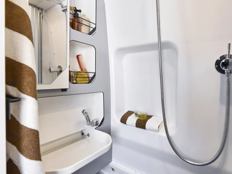 Le V600G est équipé d’une salle d'eau 3 en 1 aux solutions astucieuses pour un usage confortable. Cet espace de 790 × 860 cm est équipé d’un WC Thetford monté sur coulisses et d’un lavabo escamotable laissant un large espace douche. Un lanterneau de 28 × 28 cm permet une bonne aération de cet espace.