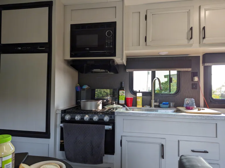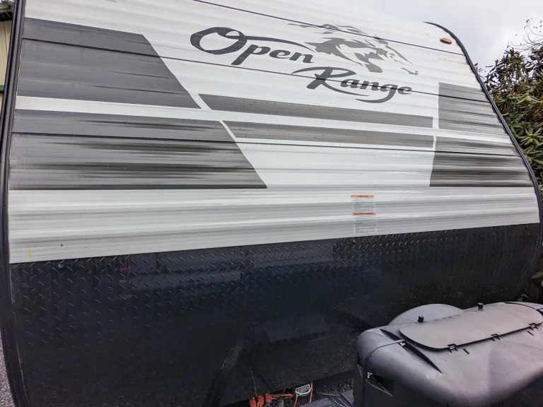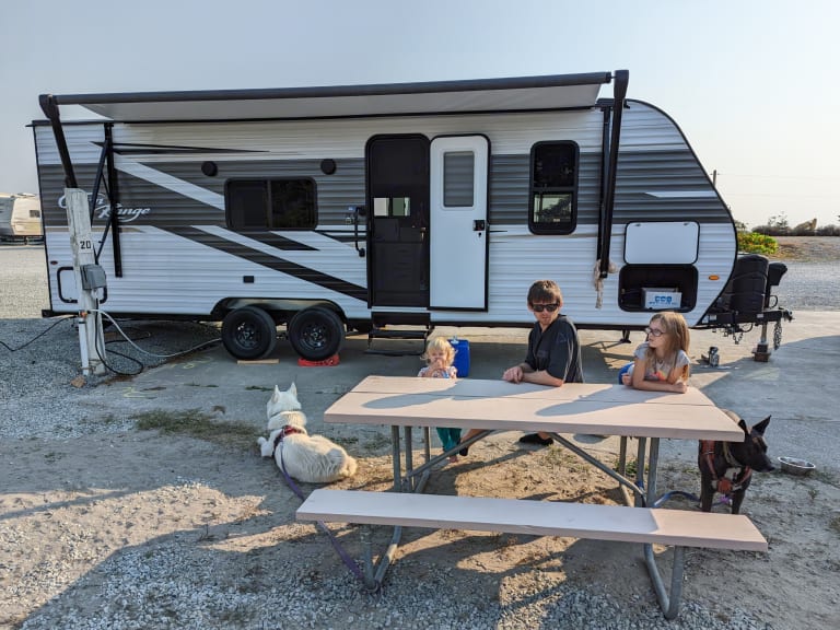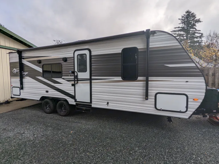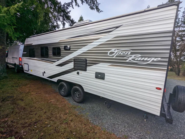 Wanderer is a 30 foot Open Range 26BH trailer that comfortably sleeps 6 adults but can sleep up to 10. Half ton towable with tons of storage for food and gear under seats, beds, and in cabinets.Sleeping & Living: Features a memory foamed queen bed in the master, memory foamed double over double bunks, dinette and couch (both with upgraded foam) convert into nearly full size beds.Kitchen & Appliances: Fully equipped with a 3 burner propane stove, propane oven (can fit a 14 inch pizza snugly), large kitchen sink with soap dispenser, fridge, and freezer.Climate & Comfort: Propane furnace for heating and air conditioning for cooling (AC requires electrical hookup/shore power). The stereo system offers Bluetooth connectivity with interior and exterior speakers.Bathroom: Complete with sink, shower, and toilet for your convenience.Outdoor Living: We provide camp chairs, a folding table, outdoor rug, and other essentials so you can relax and enjoy the great outdoors without the hassle of packing extra gear.Towing & Setup: No slide makes parking a breeze and allows you to camp anywhere! Anderson weight distribution hitch is included with rental for safe, stable towing.What's included- Assorted camp chairs (including one mini)