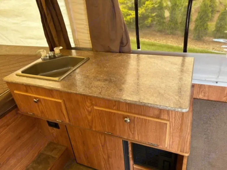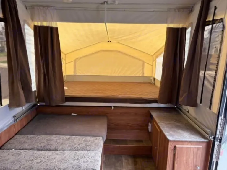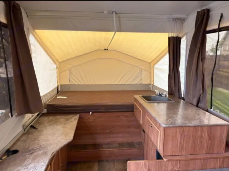 This little guy is small and compact for hauling but, can fit the whole family. This camper extends out to fit 5 adults ( 1 double bed, 1 queen, and 1 dinette fold out). This fun little camper is easy to haul being only 1500 lbs dry weight. The electronic fold out making an easy set up!What's included