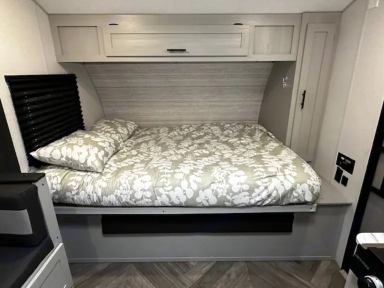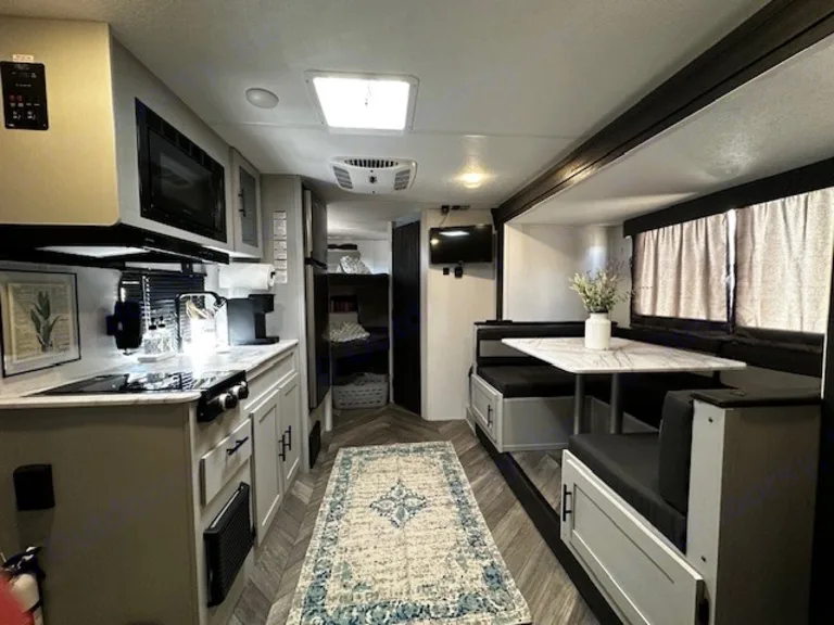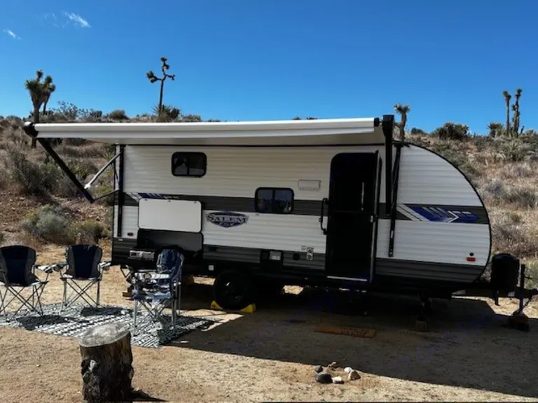 Start camping the right way in this cozy travel trailer! It features a front Murphy bed that has a queen bed to sleep on and a sofa with storage access to sit on during the day. The corner set of double bunk beds comes with storage below the bunks to keep things out of the way and is conveniently located next to the bathroom which has a shower, toilet, and sink. You can prepare your best home-cooked meals indoors with the two-burner cooktop or head to the outside LP griddle to fry up some burgers while breathing in some fresh air. Enjoy your meals, play card games, and even sleep on the U-shaped dinette slide. You will also appreciate the outside shower and the exterior front oversized door for storage access. This cozy travel trailer also has a sound system that can be accessed via Bluetooth or an aux cord. Outside there is LED lighting under the awning for the night and is used for shade during the day. This sweet home away from home is fully stocked with plates, pots, and pans, eating and cooking utensils, a Keurig coffee maker, bedding for all beds, a Hugear Boho Outdoor Plastic Straw Rug 6'x9' Waterproof, and towels for the shower and kitchen. The TV is mounted on the wall in the seating area and is equipped with a DVD player. We have provided some movies and games. ** Unfortunately, we are unable to deliver to Joshua Tree National Park.What's included• The trailer is set up for everything you would need to cook, linens for all of the beds, and towels on request. RecommendationsJoshua Tree Lake RV Campground has all the amenities and is close to JT National Park as well as Joshua Tree Downtown.Hipcamp is a great APP to find awesome and fun campsites that have none or all of the amenities one could want.